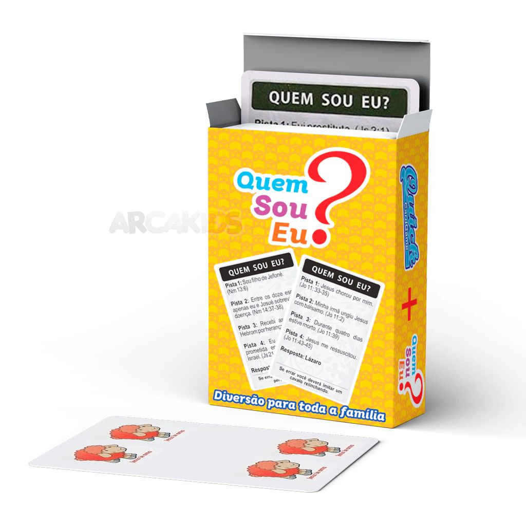 QUEM SOU EU?: Possibilita aos participantes identificar o personagem bíblico proposto través de até quatro pistas, quem acertar leva a carta. Vence o jogo quem acumular mais cartas.